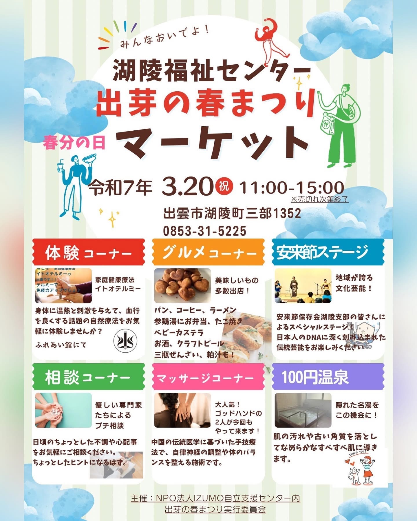 この出雲IC〜出雲多伎IC間にある湖陵ICから車で5分のところにある通称100円温泉で、湖陵福祉センター 「出芽の春まつり拡大版」を開催します。