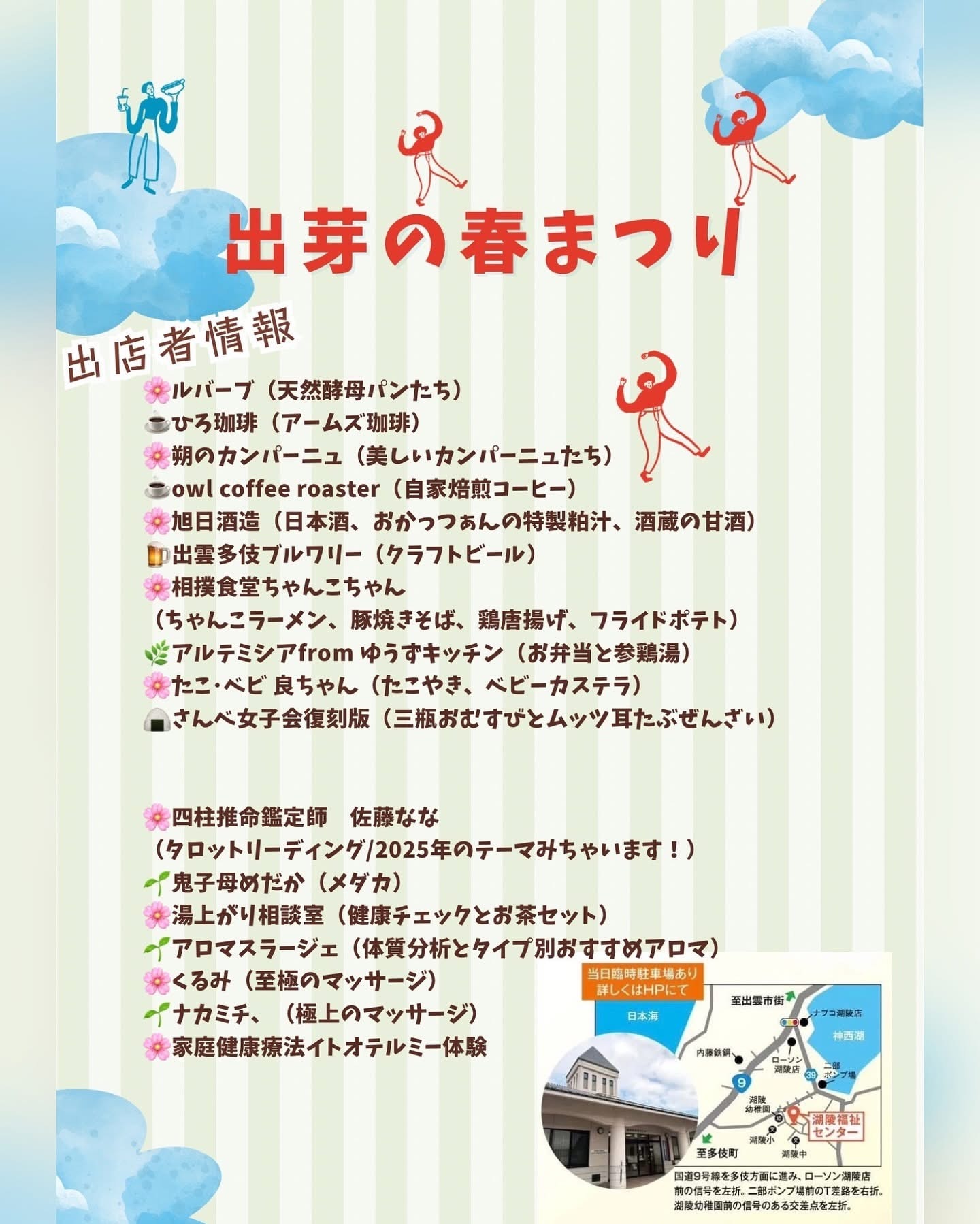 小さな街の小さな祭りですが出雲で人気のパン屋さん、朔のカンパーニュ、ルバーブが出店してくれるほか、人気占い師や、漢方薬剤師によるプチ相談のコーナーなど、密かに面白いラインナップです。